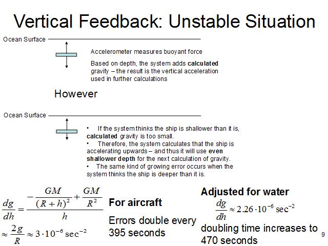 There's a difference between the doubling rate in atmosphere versus in the water, because water is a lot denser than air; as a submarine descends, it gets closer to the center of the Earth, increasing gravity, but less of the water is contributing to gravity, which decreases the rate of increase somewhat. For the aircraft case, I'm neglecting the mass of the air entirely because the effect of air wouldn't change the doubling rate by very much at all. I'll go into this in more detail later on.