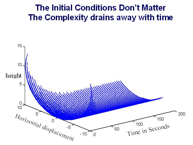 For one set of initial conditions, the pendulum's motion looks like this. Note that after about a minute and a half, the motion becomes very regular - all the complexity has drained away. It may be surprising, but in fact, no matter what the initial conditions are, given a relatively brief time, the pendulum will always come to this behavior - a simple attractor