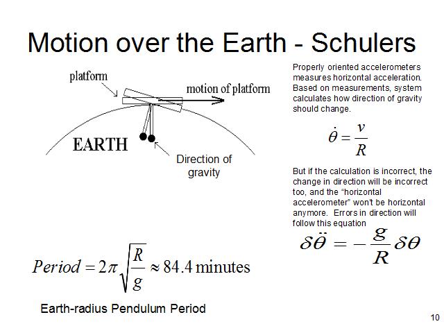Now suppose that the alignment of the platform is incorrect by a small angle delta theta. The calculation of horizontal acceleration will be incorrect by –g*sin(delta theta), because its calculation of horizontal will be incorrect, leading to a miscalculation of horizontal velocity (even if the ship is not actually moving). Due to this error, the required adjustment to theta will be incorrect - leading to this equation for the change in the theta error. This equation describes an oscillator with a period of 84.4 minutes - the Schuler Period (not-coincidentally, the period of a satellite going around the Earth at ground-level.