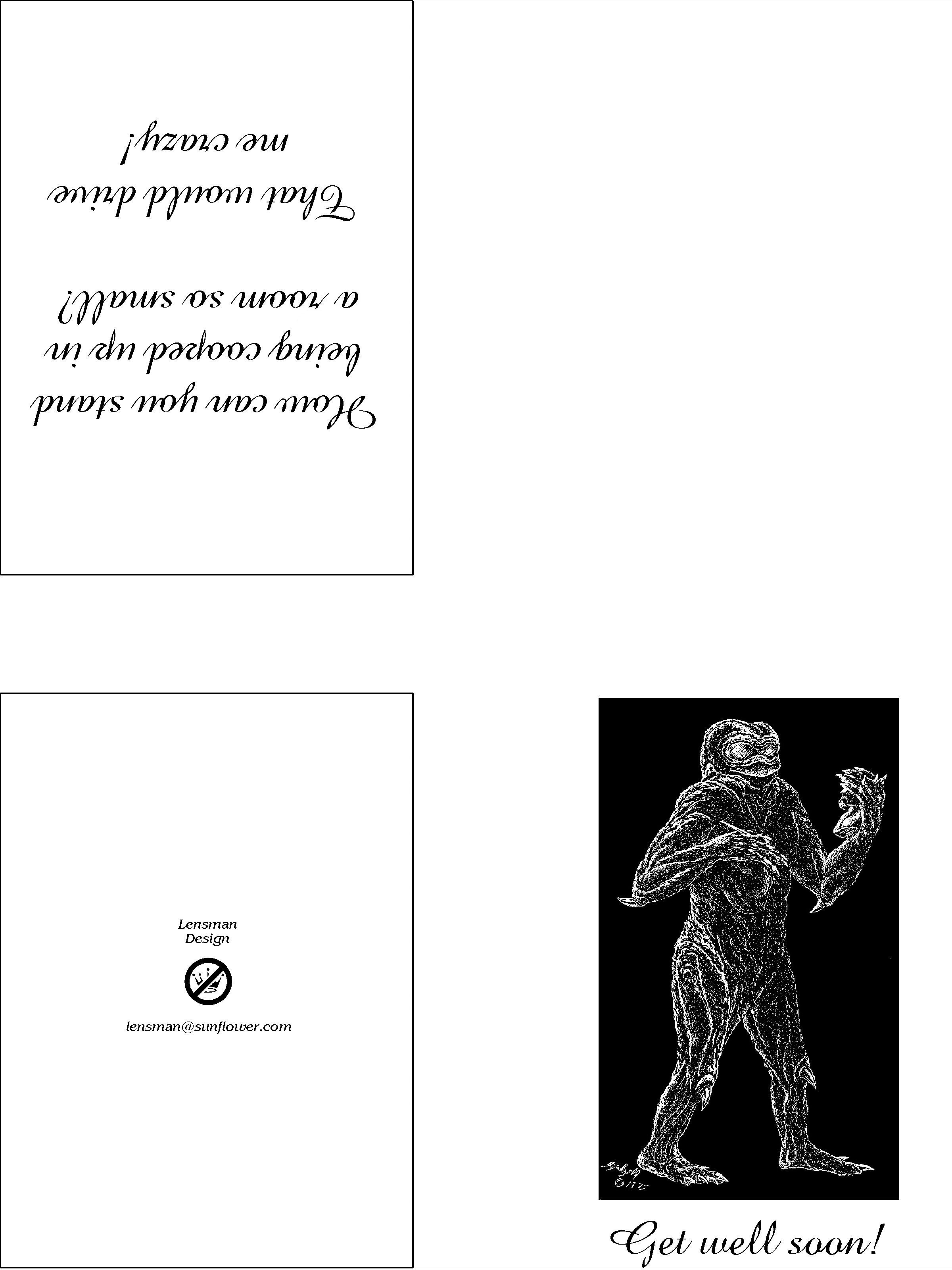 INSIDE: "We would visit in person, but your hospital has some silly objection to visitors weighing over ten tons." - . Bandersnatch-- Treaty Violation