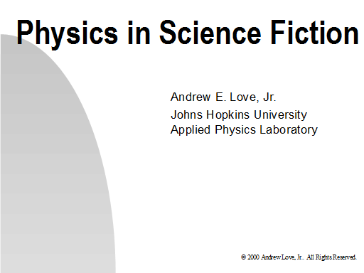 Good afternoon. My name is Andrew Love; in my work I give presentations on a variety of dry topics, so I enjoy the opportunity for something different: the science, and particularly the physics that can be found and played with in various science fiction stories. I was inspired to create this talk after attending the "SF and Education" panels at the 1998 Worldcon; since then I've given versions of this talk at two college campuses and various other places. This version, I've updated in October 2014 in response to some corrections provided by "Catty Nebulart" and some from Dr. Shannon Hall (thanks to both of you, very much!).