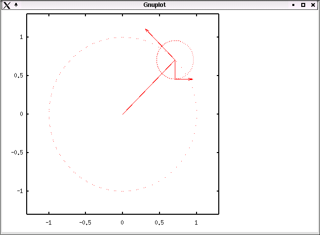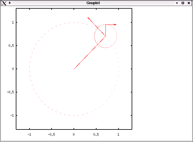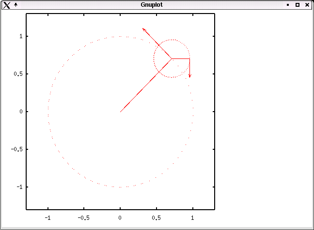 We could just as easily push the ball backwards, opposite to the merry-go-round's rotation. But there is a difference. In the forward case, the ball's rotation and the merry-go-round's rotation add. In the backward case, they subtract. So the periods of the motions in the two directions will be different. In the backwards case, the ball needs more speed in order to fight the tether's restoring forces, and so it will oscillate with a higher frequency (the motion will have a lower period). For the simple example problem I solved which trying to debug my Ringworld analysis program, the merry-go-round spun at 2 radians per second, the ball weighed 1 kilogram, and the springs that held it in place (in two perpendicular directions) had stiffnesses of 104 Newtons/meter. The frequency of motion in the posigrade direction already shown was 8.198 radians/second and in the retrograde direction was 12.198 radians/second. The second pair of vectors is shown in the next figures,